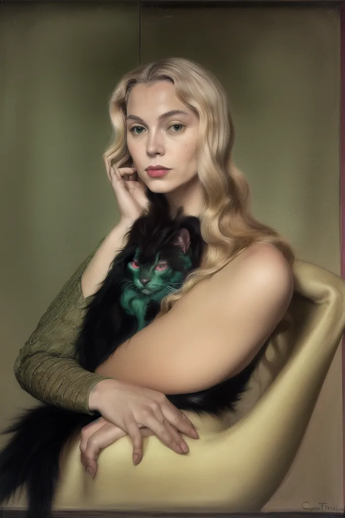 “surrealist portrait of blonde female chimera by fini (sfumato) (claroscuro), perspective,green, pink, colorful, chimera, catwoman, furry, water, sexy, curly hair”