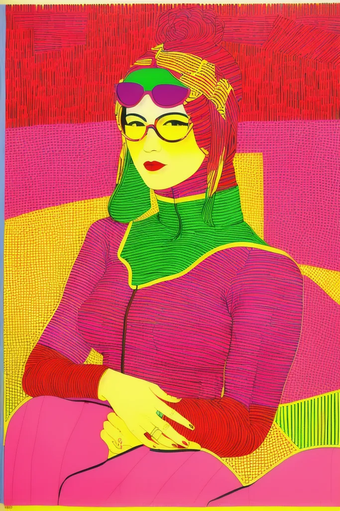 “minujin, popart, artwork, colorfull, stripped, red, magenta, yellow, green, purple, orange a woman in a bright catsuit and sunglasses”
