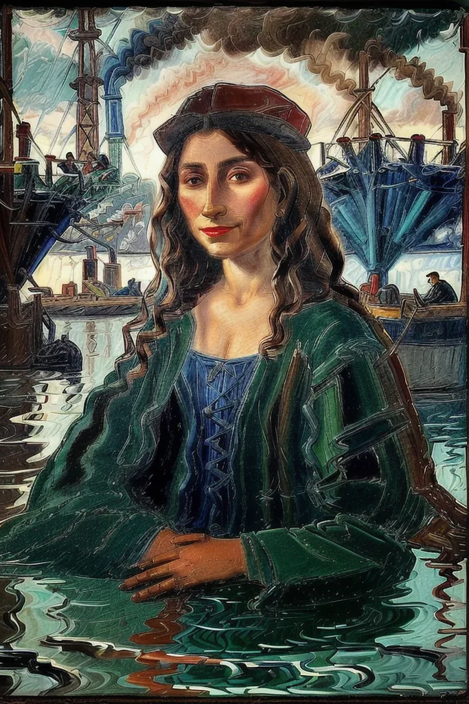 “a red, green, blue and brown day at the harboard, workers, men, portrait of a la gioconda, quinquela, colorful, water, reflections, clear sky, sun”