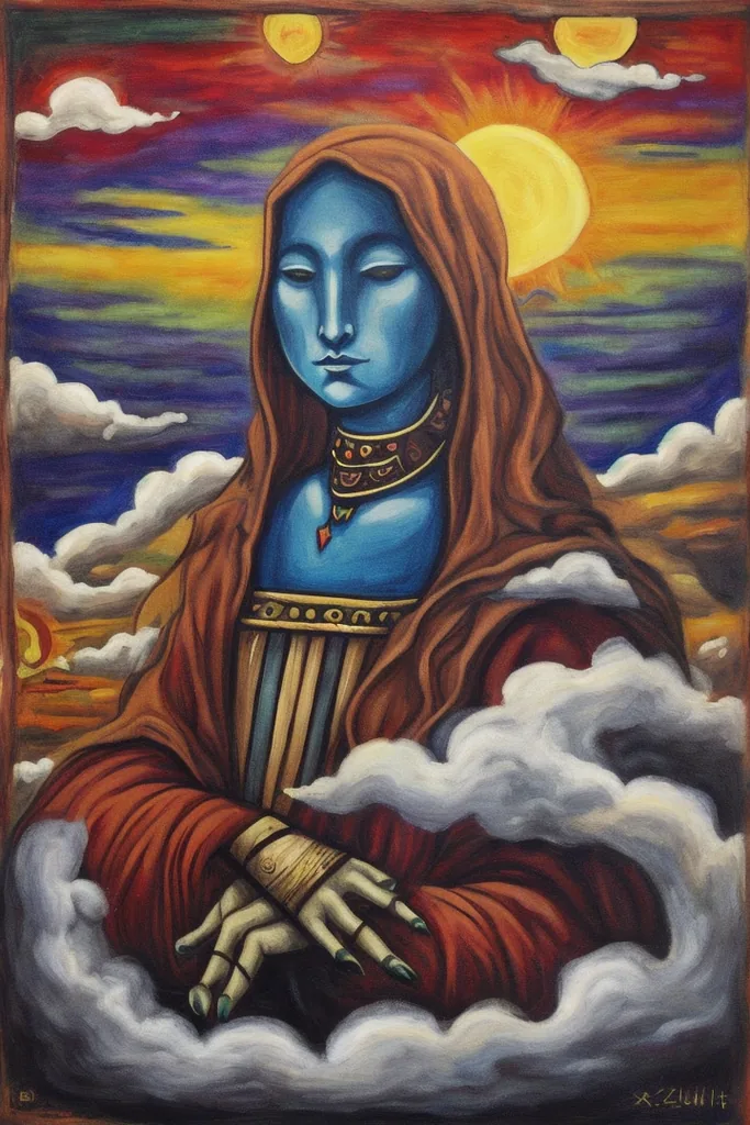 “xul solar, painting, no humans, traditional media, creature, surreal, abstract, sun, zodiac, parody, clouds, sky”