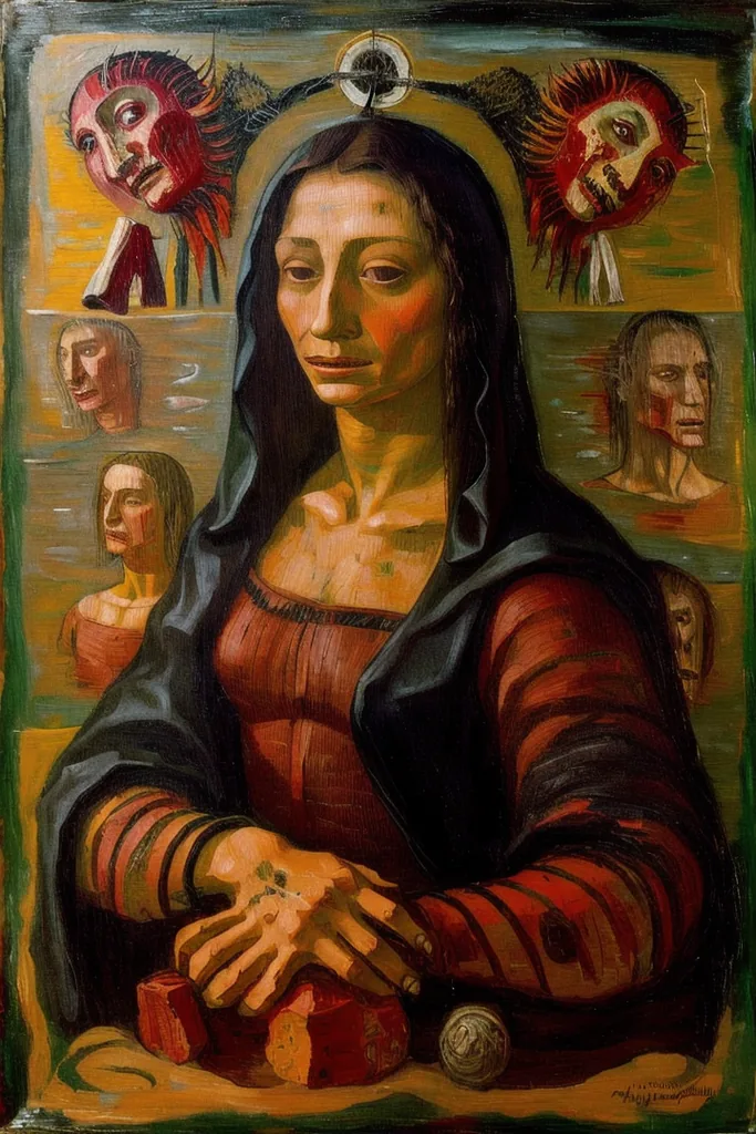 “surreal abstract portrait of la gioconda, crucified, hell, horror, forner, hellish landscape, blood, colorful”