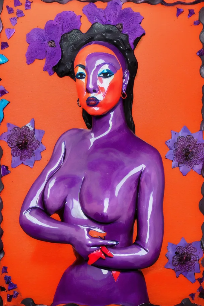 “(noma),(sculpture),a woman,sexy,lipstick,colorful,(photograph of a ceramic sculpture) on orange and purple,expressive,nsfw,”
