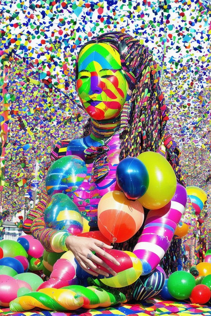 “(minujin), (popart), artwork, colorfull, (confetti stripped), balloon instalation, stripped, colorful, woman balloon sculpture, a colorful inflatable slide in a yard, city park background”
