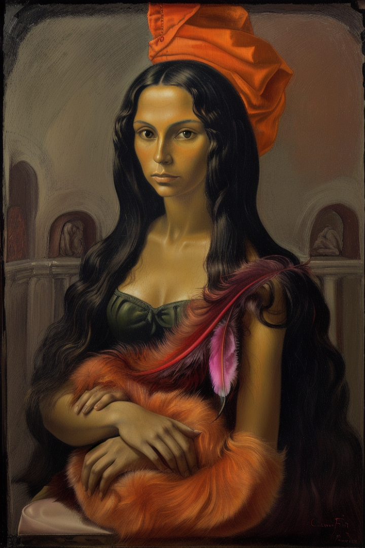 “surrealist portrait of la gioconda by fini (sfumato) (claroscuro), perspective,red, orange, green, pink, colorful, chimera, feathers, water, sexy, curly hair”