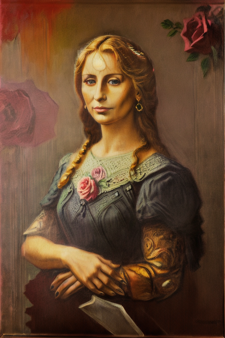 “colorful painting of a blonde gioconda, oil on canvas, red, white, garden background, grass, outdoors, roses, lilies, de la carcova”