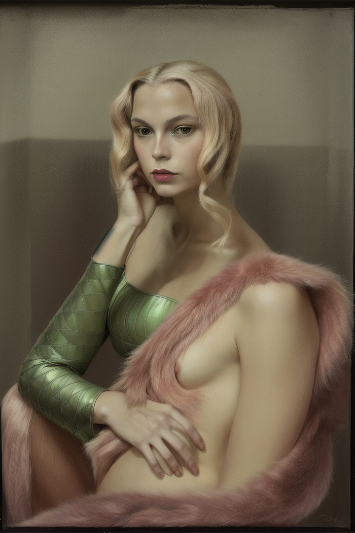 “surrealist portrait of blonde female chimera by fini (sfumato) (claroscuro), perspective,green, pink, colorful, chimera, catwoman, furry, water, sexy, curly hair”