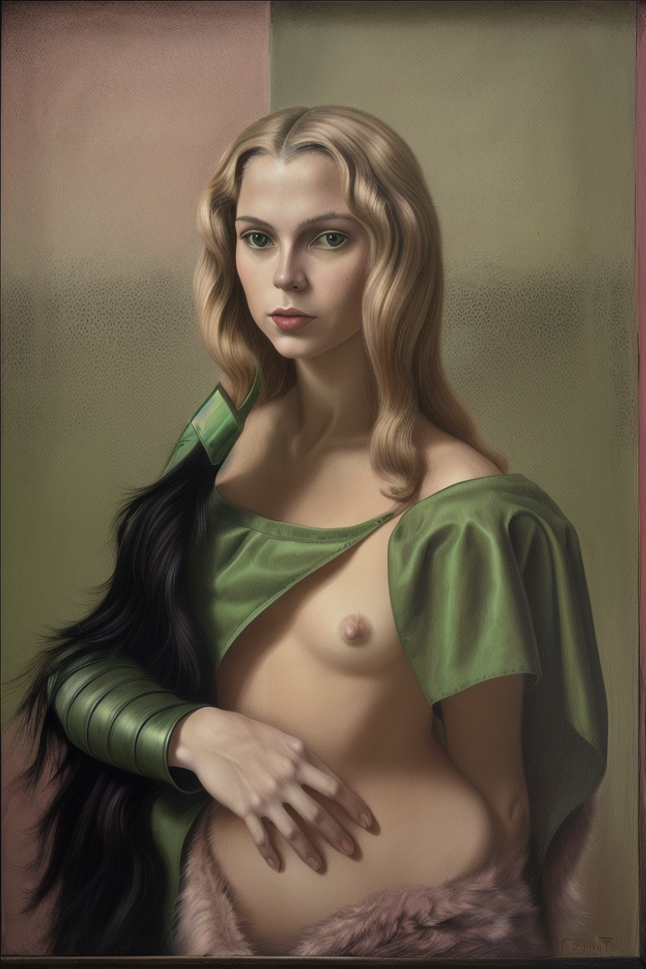 “surrealist portrait of blonde female chimera by fini (sfumato) (claroscuro), perspective,green, pink, colorful, chimera, catwoman, furry, water, sexy, curly hair”