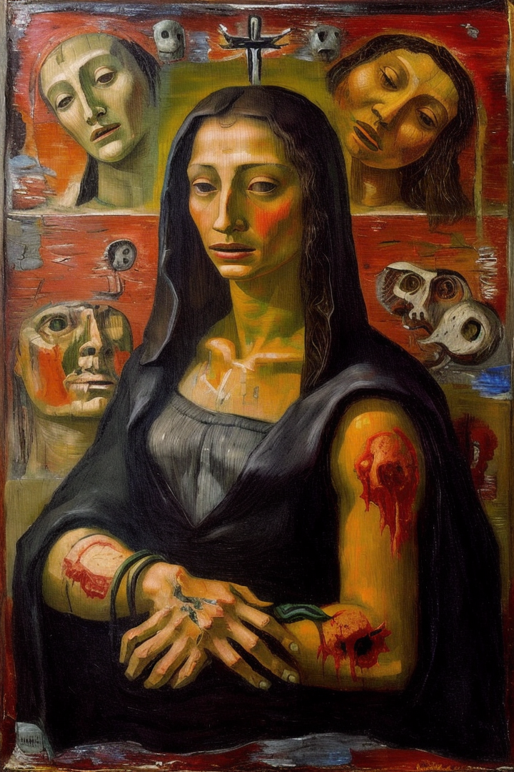 “surreal abstract portrait of la gioconda, crucified, hell, horror, forner, hellish landscape, blood, colorful”