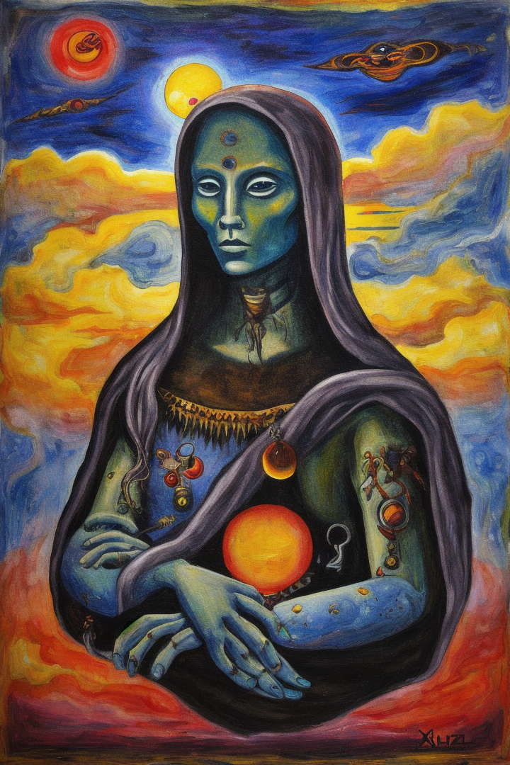 “xul solar, painting, no humans, traditional media, creature, surreal, abstract, sun, zodiac, parody, clouds, sky”