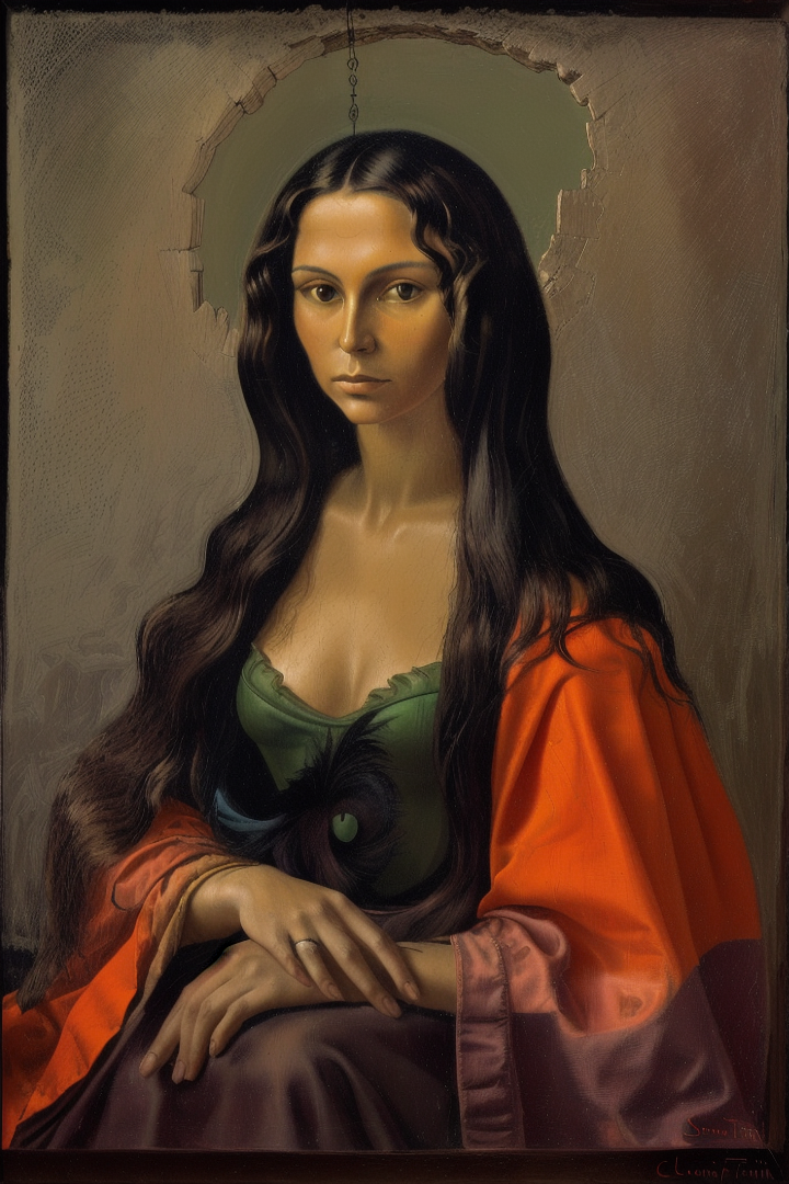 “surrealist portrait of la gioconda by fini (sfumato) (claroscuro), perspective,red, orange, green, pink, colorful, chimera, feathers, water, sexy, curly hair”
