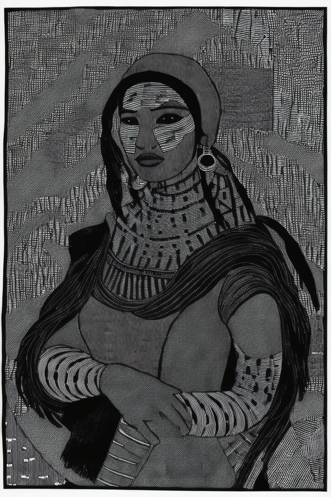 “diseño, indigena, argentino, cienaga monochrome, comic, greyscale, no humans, black background, black border”