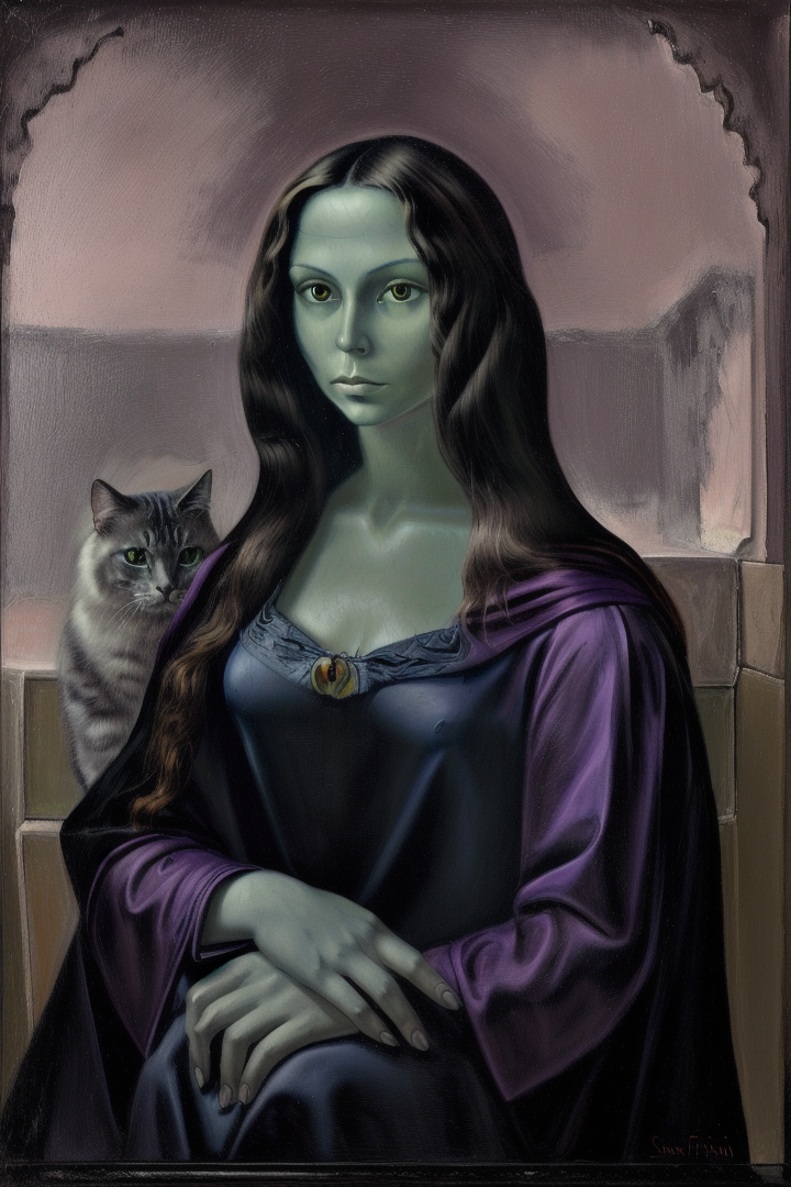 “surrealist portrait of la gioconda by fini (sfumato) (claroscuro), perspective,blue, purple green, pink, colorful, chimera, cats, catwoman, furry, water, sexy, curly hair”