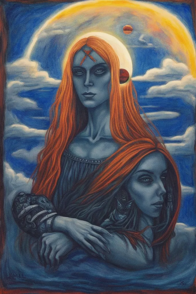 “xul solar, no humans, woman, surreal, abstract, moon, zodiac, parody, clouds”
