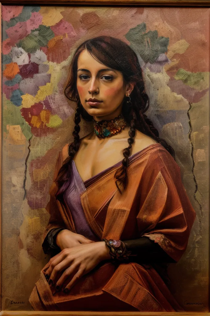 “colorful painting of a woman, oil on canvas, flowers, cloth, de la carcova”