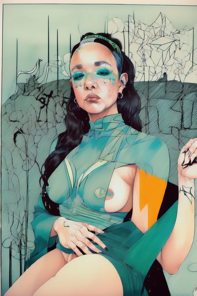 “(noma:1.8),(artwork) hand drawn pencil sketch,(lineart),outline,(expressive),sexy (nsfw),argentina,gouache,black blue green,,”