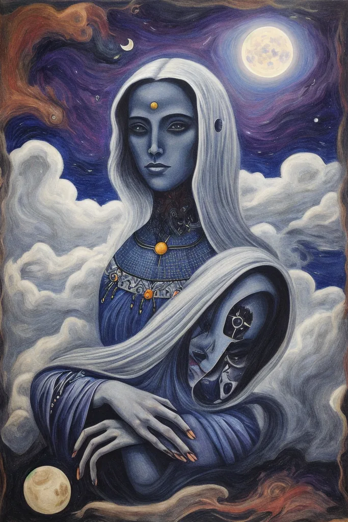 “xul solar, no humans, woman, surreal, abstract, moon, zodiac, parody, clouds”
