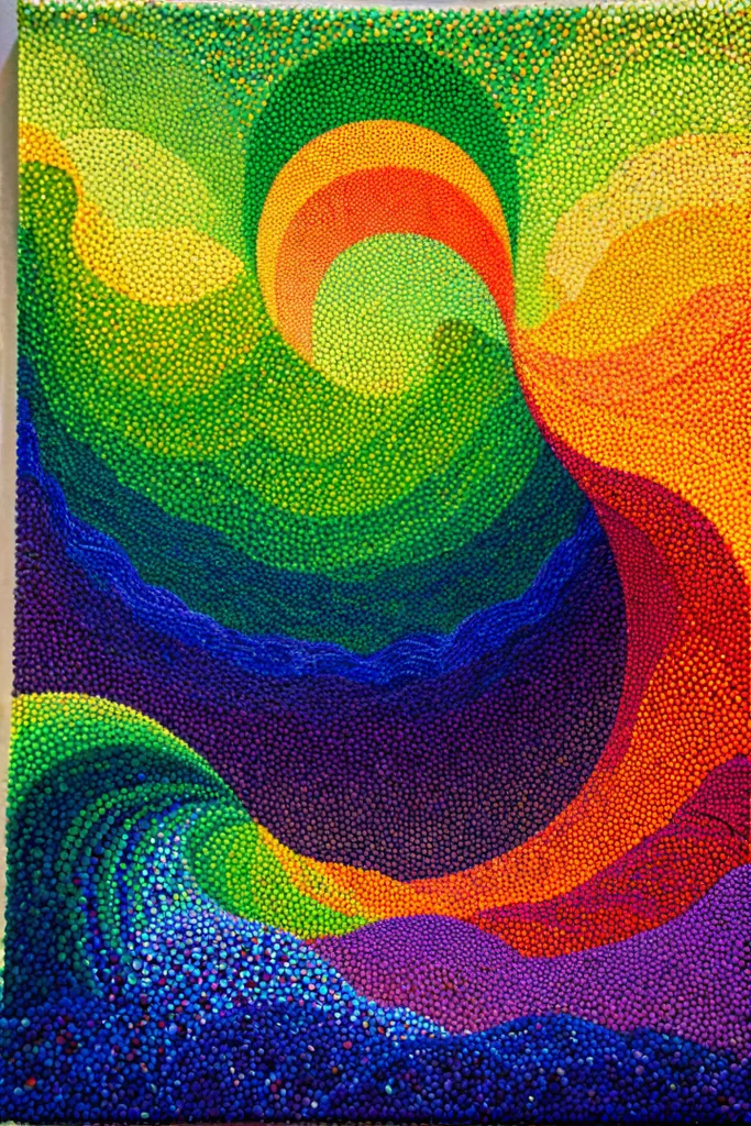 “la gioconda, ((wave)) made of rainbow colored particles of light Le Parc abstraccion geometrica green, blue, pointillism, puntillismo, rainbow, red, orange, yellow, purple, violet, particles, puntos, points (detailled) ((masterpiece)), (top quality)”