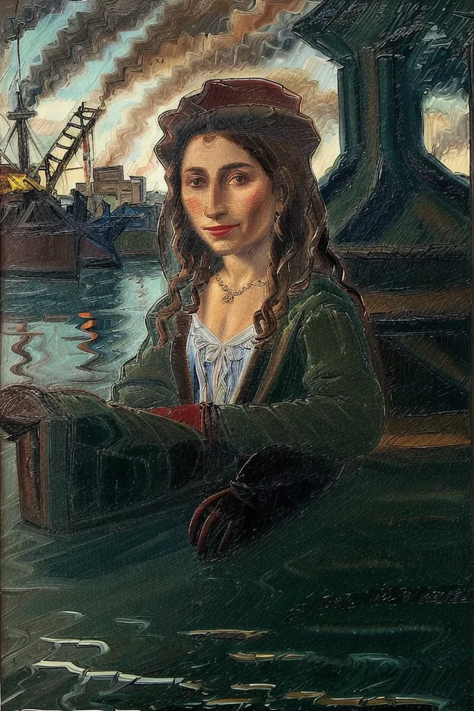 “a red, green, blue and brown day at the harboard, workers, men, portrait of a la gioconda, quinquela, colorful, water, reflections, clear sky, sun”