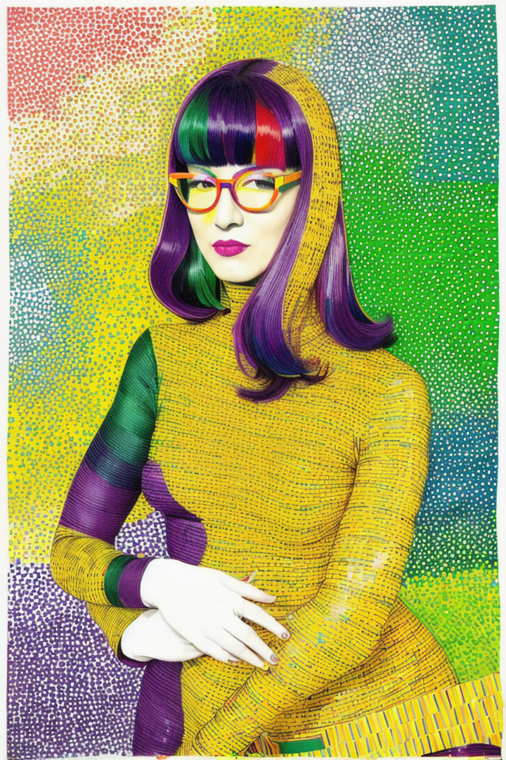 “(minujin), (popart), artwork, colorfull, (confetti stripped), yellow, purple, green, orange, portrait of a woman in a bright catsuit and glasses, white background”
