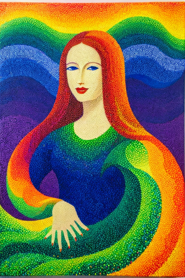 “la gioconda, ((wave)) made of rainbow colored particles of light Le Parc abstraccion geometrica green, blue, pointillism, puntillismo, rainbow, red, orange, yellow, purple, violet, particles, puntos, points (detailled) ((masterpiece)), (top quality)”