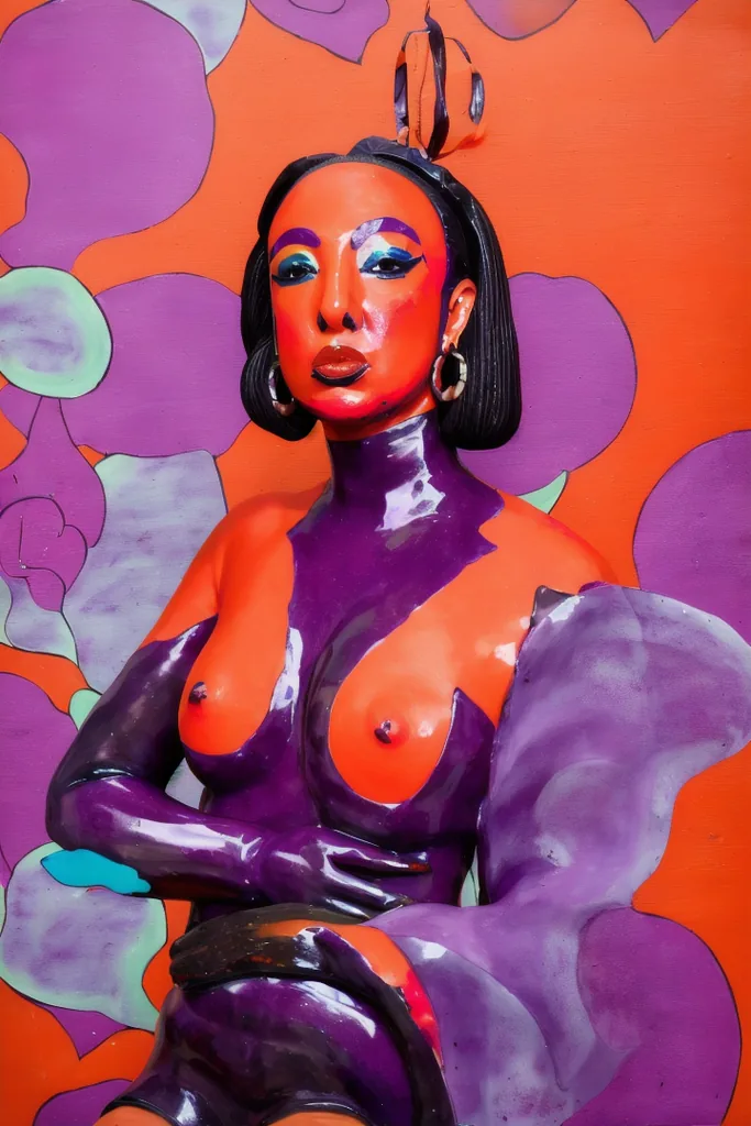 “(noma),(sculpture),a woman,sexy,lipstick,colorful,(photograph of a ceramic sculpture) on orange and purple,expressive,nsfw,”