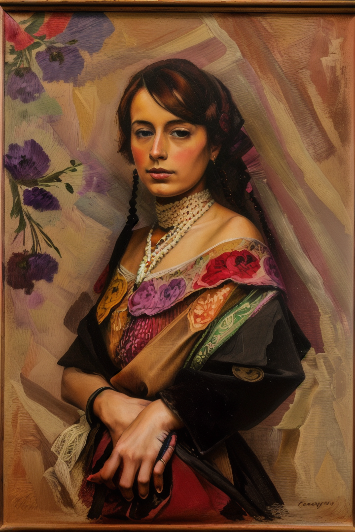 “colorful painting of a woman, oil on canvas, flowers, cloth, de la carcova”