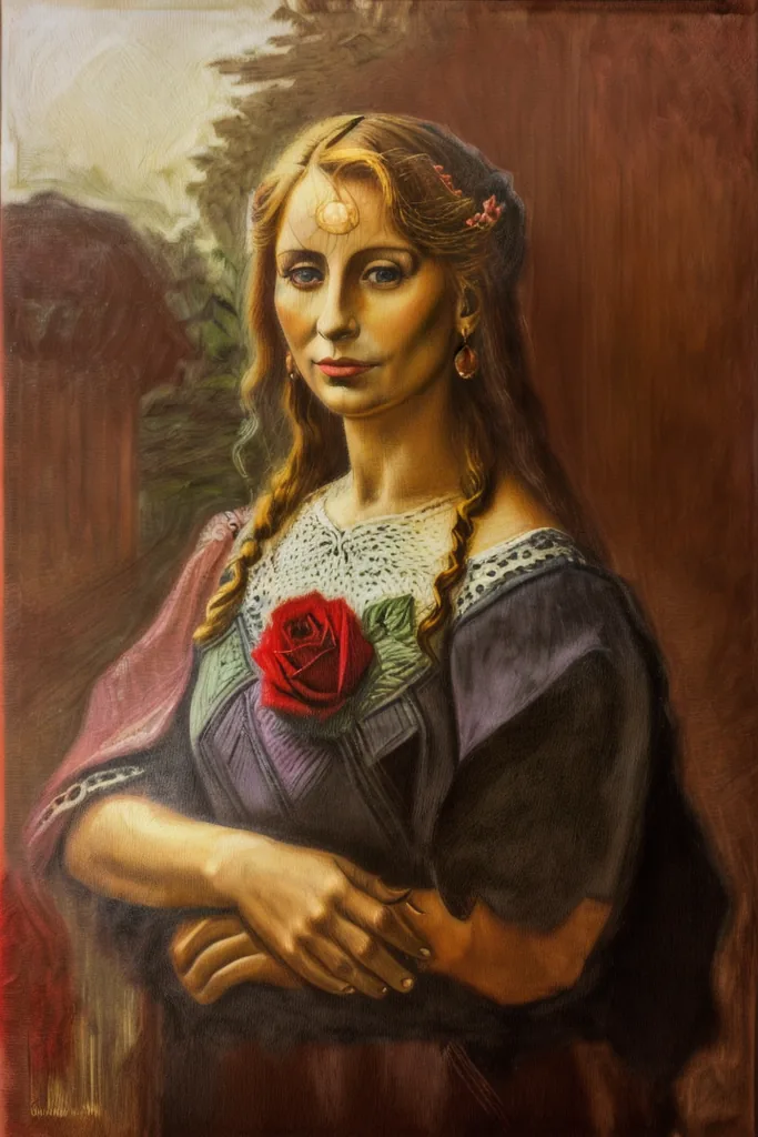 “colorful painting of a blonde gioconda, oil on canvas, red, white, garden background, grass, outdoors, roses, lilies, de la carcova”